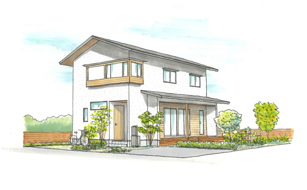| 軒を深くすることで夏には日差しを遮り、冬には日差しを取り込みます。屋根は、ガルバリウム鋼板立ちハゼ葺きとし、外壁材は吹き付け仕上とし、クラックが入りにくく汚れにくい素材を採用します。流行に左右されない趣がある落ち着いた外観を演出し、風景に溶け込み飽きのこない外観を目指します。 ・外壁仕上:「マジックコートフレックス」(株式会社フッコー) |